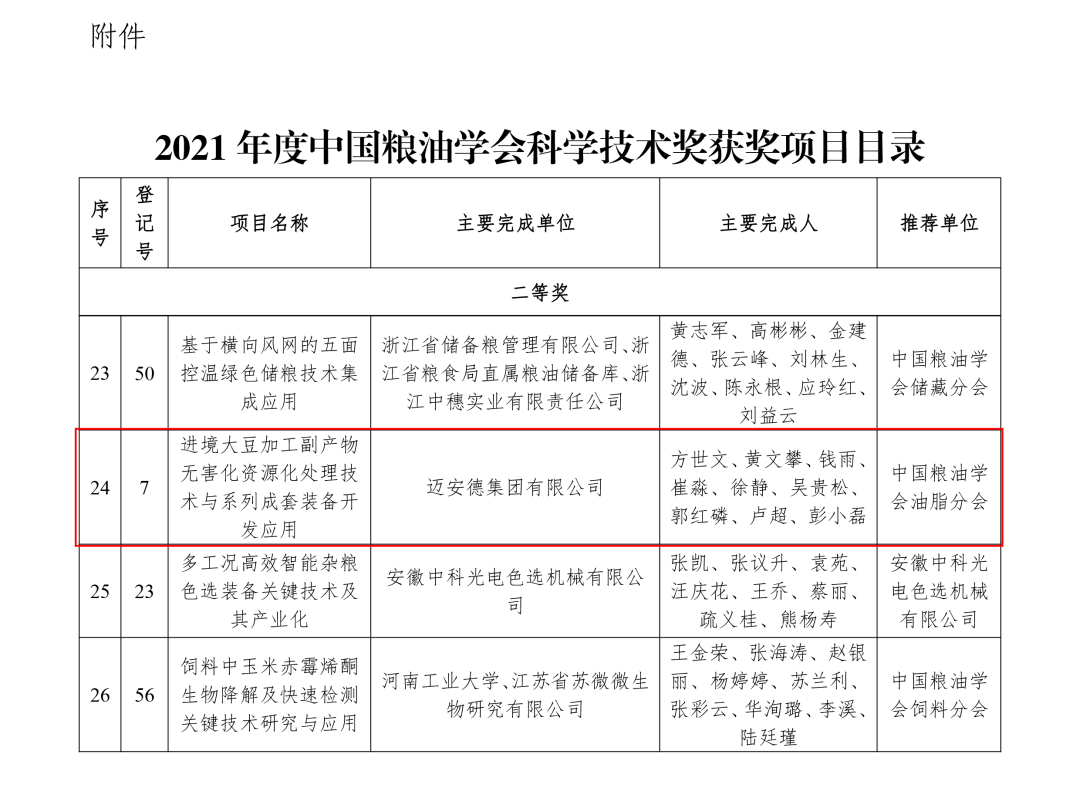 日前,2021年度中國糧油學(xué)會(huì)科學(xué)技術(shù)獎(jiǎng)獲獎(jiǎng)項(xiàng)目名單正式公布,邁安德集團(tuán)“進(jìn)境大豆加工副產(chǎn)物無害化資源化處理技術(shù)與系列成套裝備開發(fā)應(yīng)用”項(xiàng)目榮獲中國糧油學(xué)會(huì)科學(xué)技術(shù)獎(jiǎng)二等獎(jiǎng)。