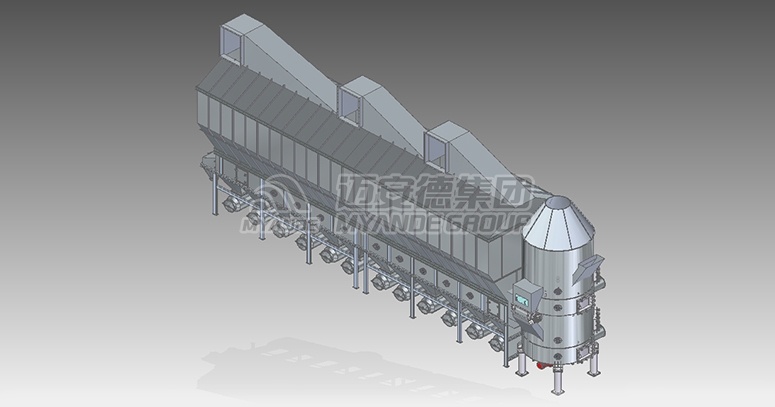 邁安德多級(jí)流化塔包含預(yù)干燥塔和臥式流化床兩部分,根據(jù)產(chǎn)量和物料的不同,預(yù)干燥塔直徑與臥式流化床加熱面積均不一樣。