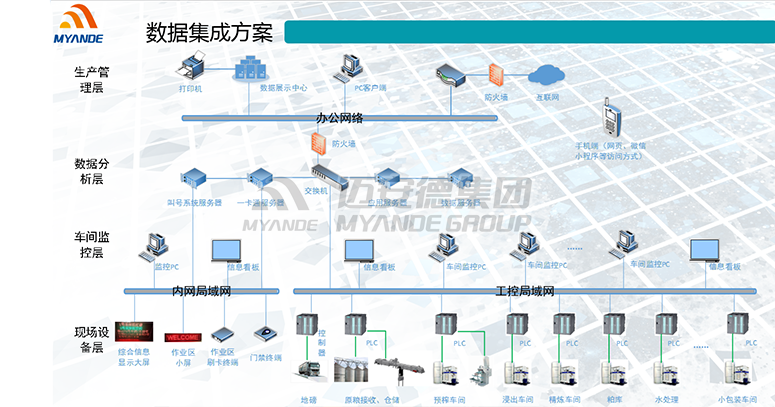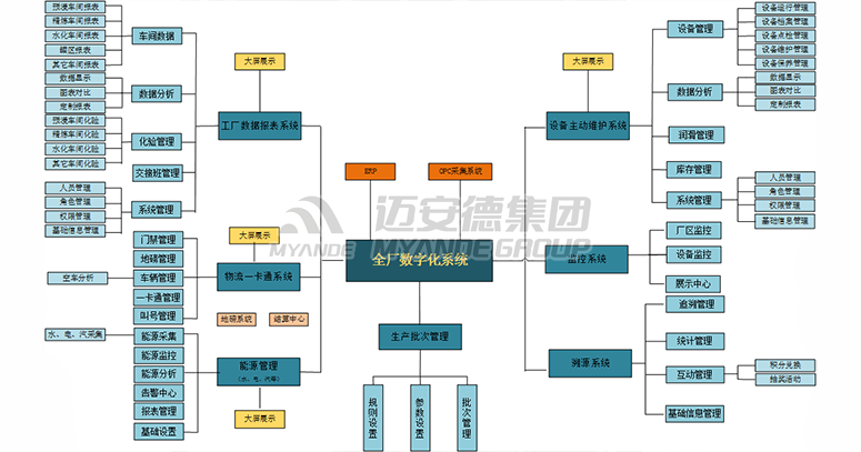 邁安德基于最新的工業(yè)4.0理念,通過工廠內部網絡,對各車間生產數據通過PLC進行采集,與實際業(yè)務數據(采購、原料、批次、運輸、生產、化驗、倉儲、銷售、財務等)充分結合,運用數據整合、報表分析使客戶實現全廠生產運營過程的自動化、透明化、可視化、精益化、數據化,打造全新的智能化工廠。